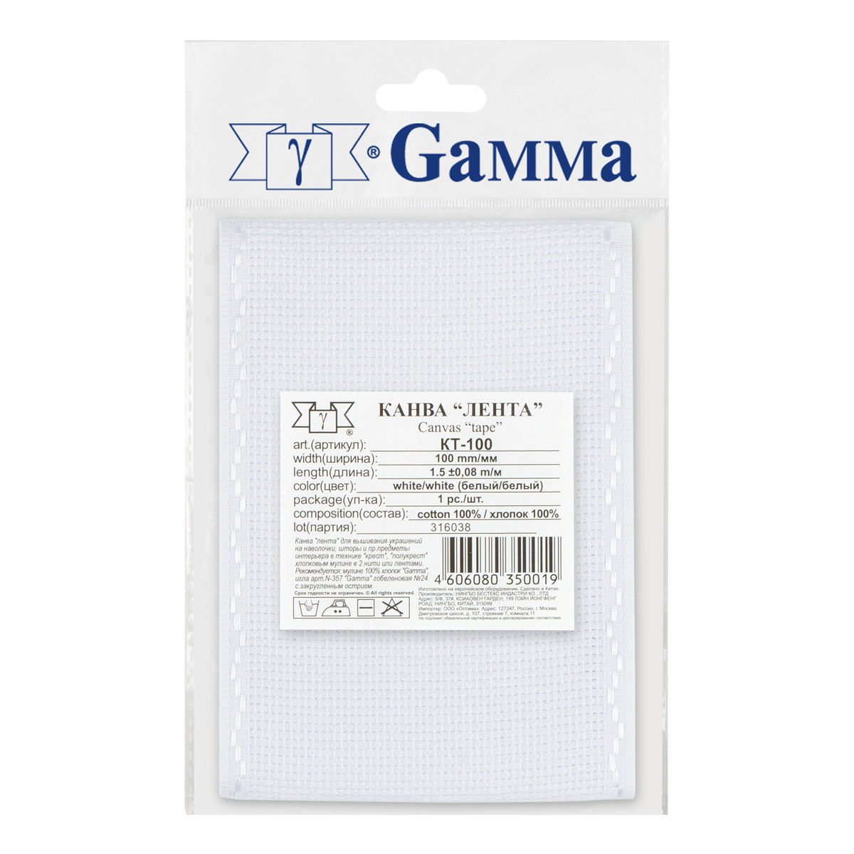 Канва KT- 100 " Gamma" " лента" Aida №14 100% хлопок 100 мм 1. 5 м белый/ белый